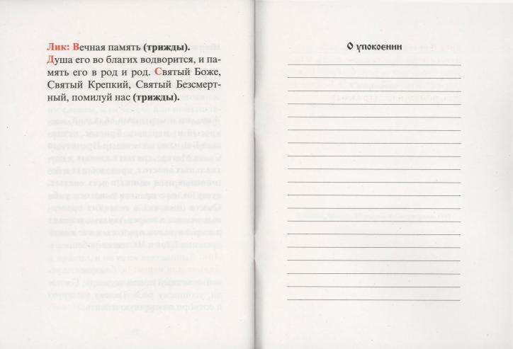 В брошюре небольшого формата представлены последования молебна и панихиды, напечатанные в два цвета гражданским шрифтом на качественной офсетной бумаге. Издание содержит страницы с помянником о здравии и упокоении.