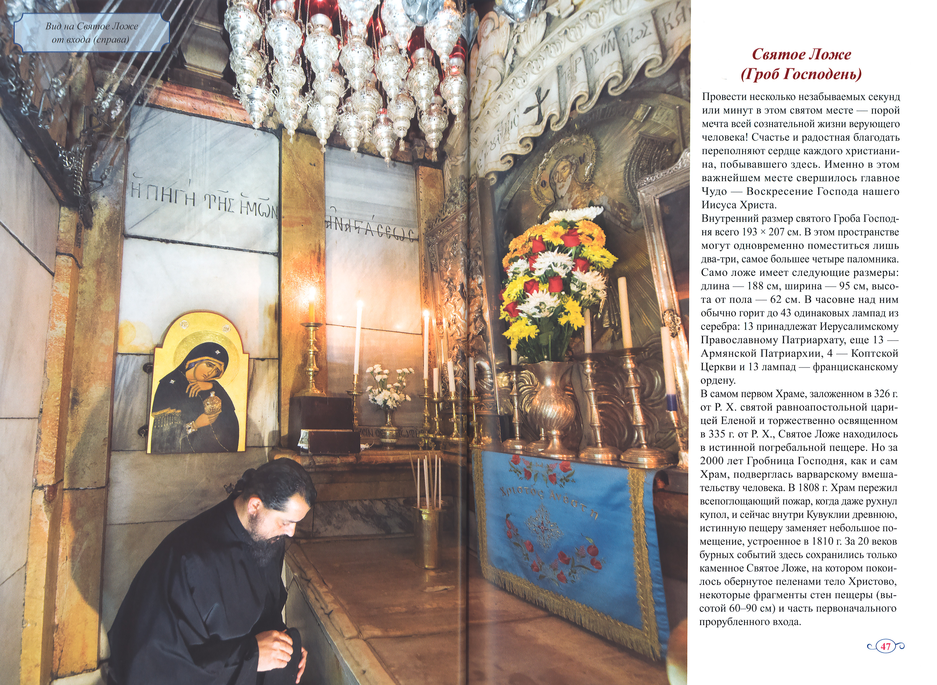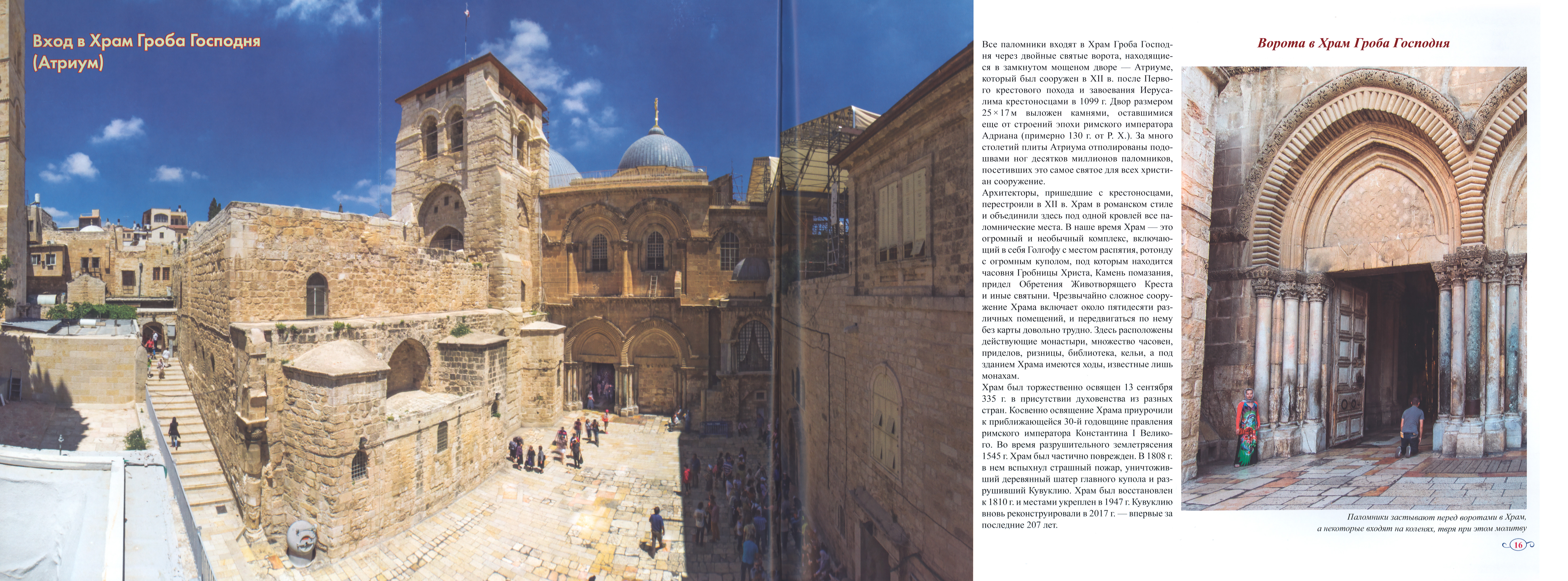 Храм Гроба Господня в Иерусалиме является главным храмом для всех христиан. В наши дни Храм — это необычный архитектурный комплекс, включающий в себя Голгофу с местом распятия Спасителя, Камень помазания, Кувуклию с гробницей Христа, пещеру обретения Животворящего Креста, а также иные святые места, вызывающие у верующих людей благоговение. Освященный в далеком 335 г. от P. X., сегодня Храм Гроба Господня во внутренних и внешних пяти уровнях состоит из порядка 50 помещений: церквей, часовен, приделов, ризниц, келий монахов, колоколен.