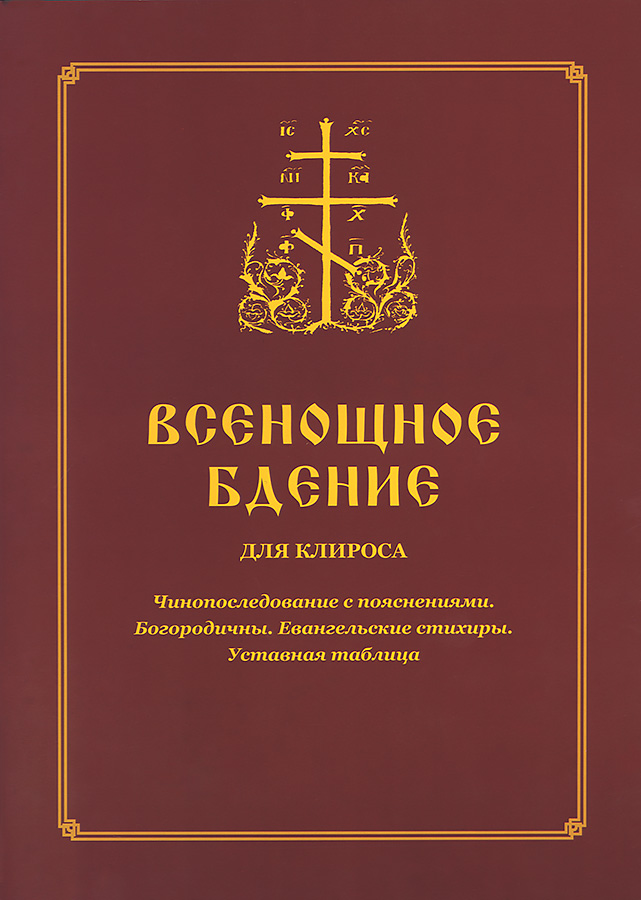 В книге содержатся богослужебные тексты, напечатанные крупным шрифтом с разметкой для пения на клиросе: полное последование всенощного бдения наряду, а также приложения воскресных Богородичнов к тропарям, к стихирам, Евангельские стихиры, Уставная таблица совмещения воскресной службы со службой празднуемому или малому святому.