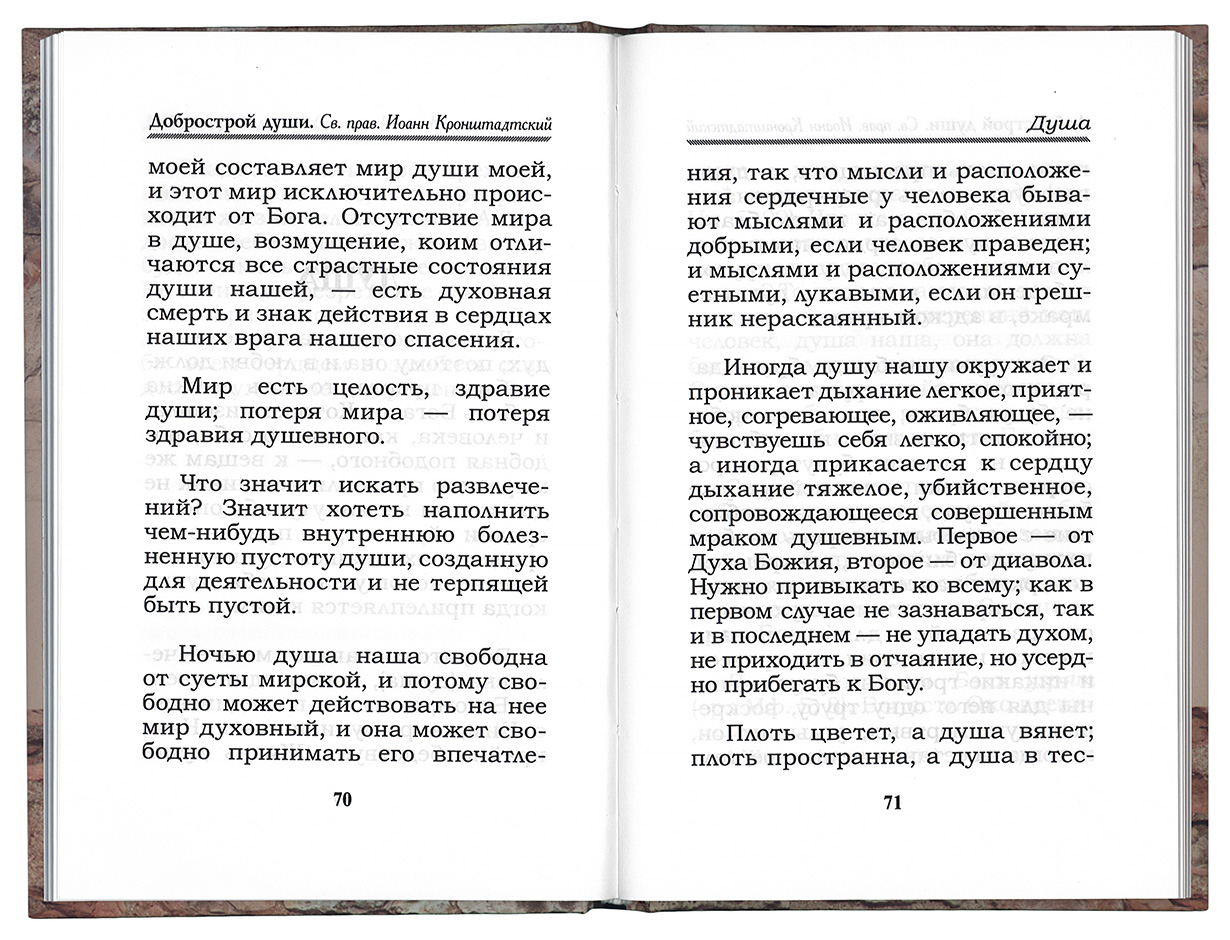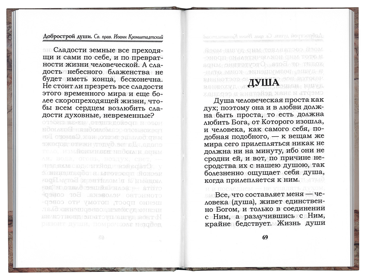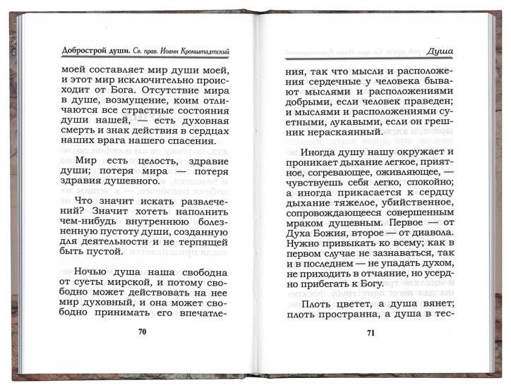 В книге «Добрострой души» представлены избранные места из творений uch-2413-nnn:святого праведного Иоанна Кронштадтского:nnn, составленные uch-2423-nnn:священником Александром Ельчаниновым:nnn. Завершает издание житие святого праведного Иоанна Кронштадтского.